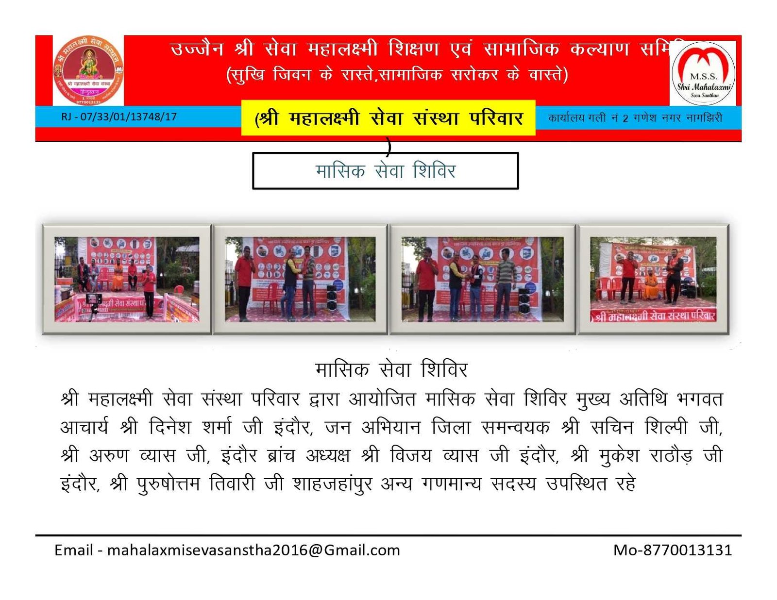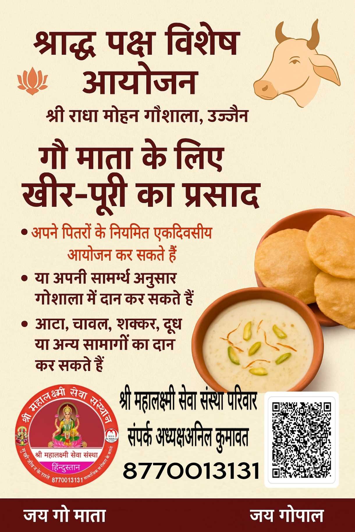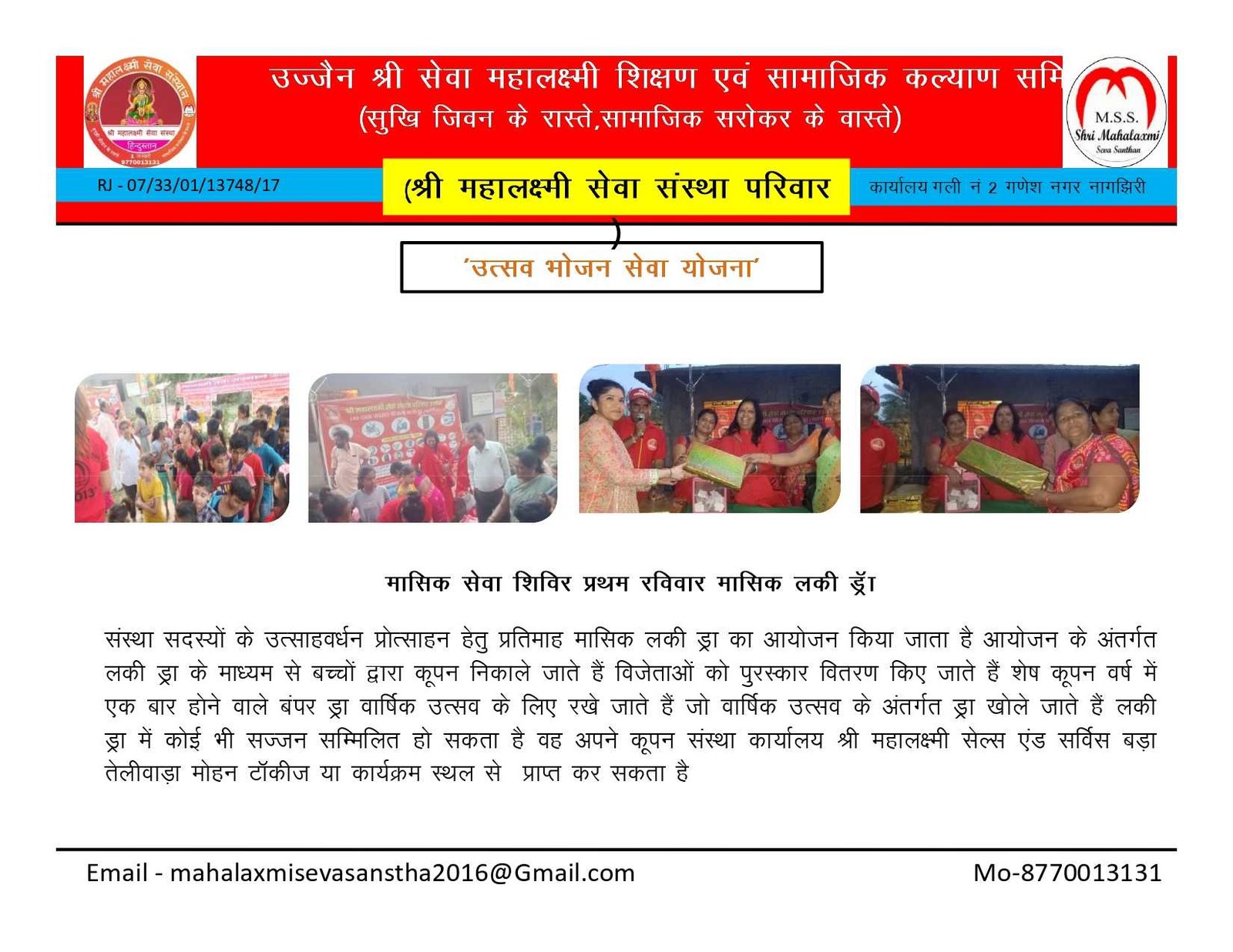 • गौशाला की अर्जेंट आवश्यकता , • निशुल्क कन्या विवाह, • श्राद्ध पक्ष में गौ सेवा भंडारा, • कार्यकारिणी मीटिंग मांह के प्रथम रविवार, • एक घंटा गौ सेवा के नाम योजना, • श्री राधा मोहन गौशाला उज्जैन, • अमावस्या गौ सेवा भंडारा प्रत्येक माह , • श्री महालक्ष्मी सेवा संस्था विशेष कार्यक्रम , • श्री महालक्ष्मी सेवा संस्थान,