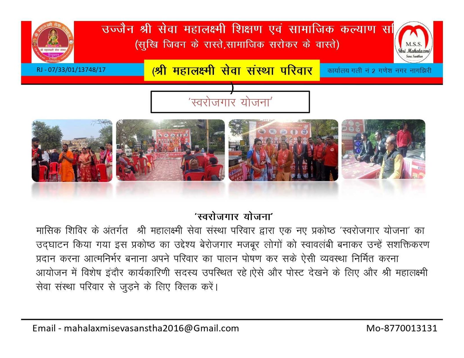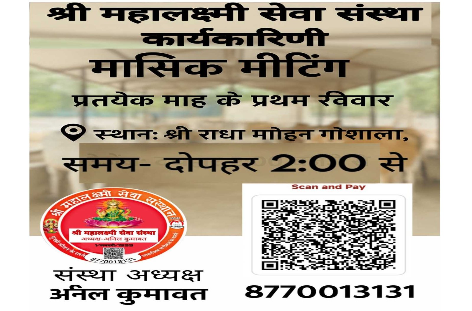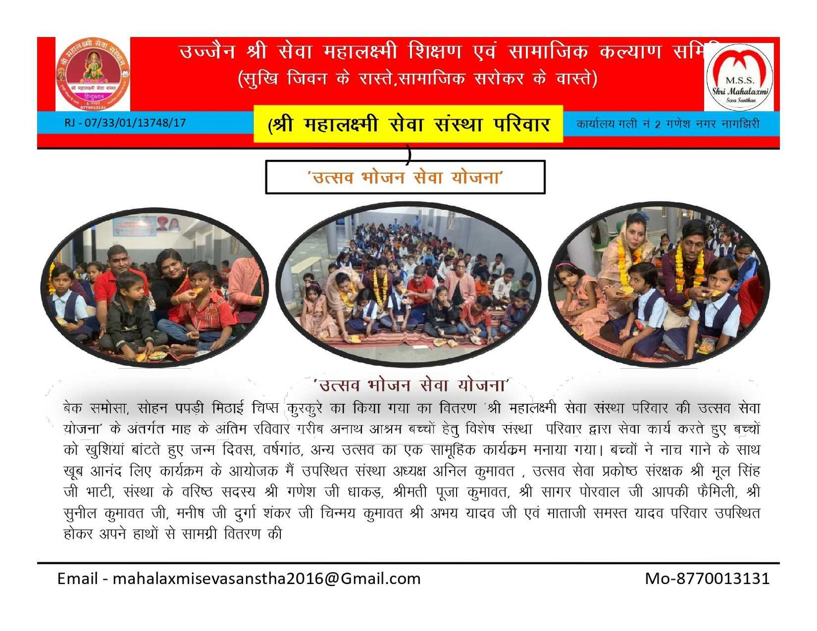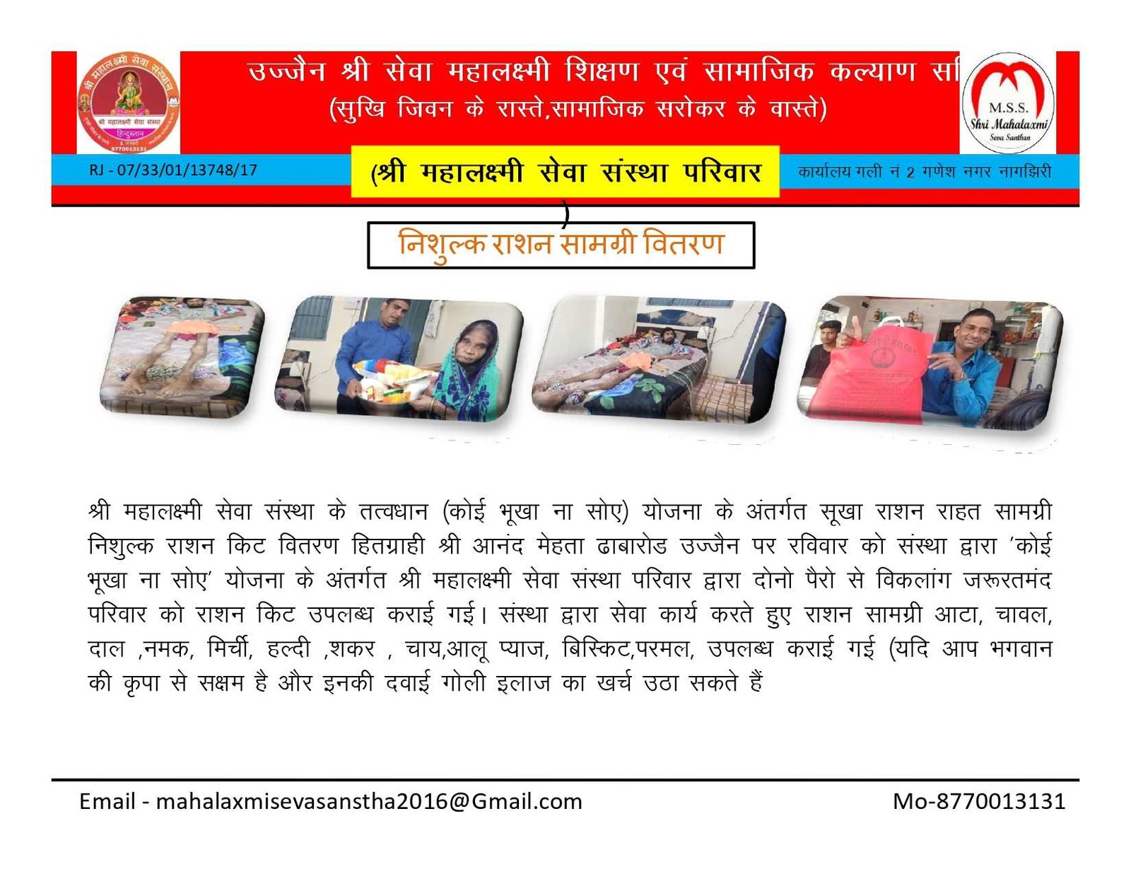 • गौशाला की अर्जेंट आवश्यकता , • निशुल्क कन्या विवाह, • श्राद्ध पक्ष में गौ सेवा भंडारा, • कार्यकारिणी मीटिंग मांह के प्रथम रविवार, • एक घंटा गौ सेवा के नाम योजना, • श्री राधा मोहन गौशाला उज्जैन, • अमावस्या गौ सेवा भंडारा प्रत्येक माह , • श्री महालक्ष्मी सेवा संस्था विशेष कार्यक्रम , • श्री महालक्ष्मी सेवा संस्थान,